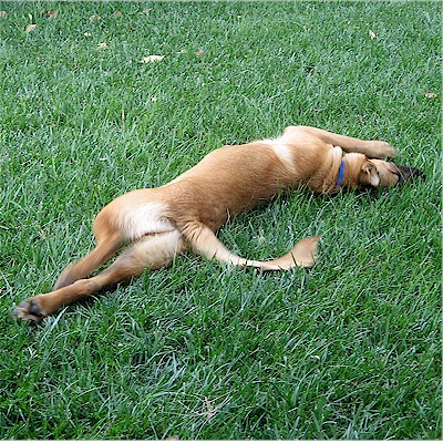 Molly May has great house manners, settles quietly on her bed when she goes indoors, and is crate trained. Outdoors, she loves to play fetch, and brings the ball right back to her human's feet in a blur; we have yet to find out how many ball tosses it would take to bore her with the game.