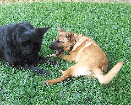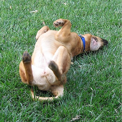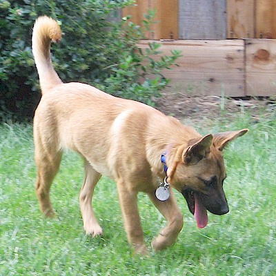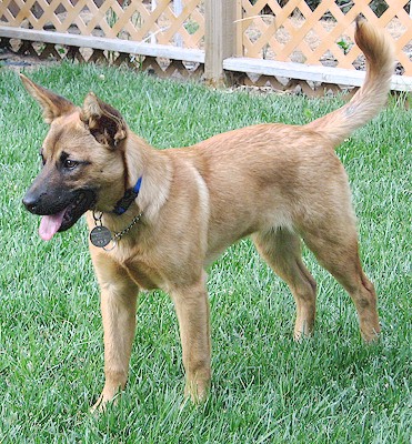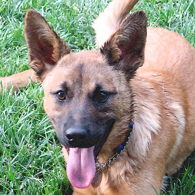 She's a typical Mali puppy -- sweet, sassy, feisty and fearless. She loves nothing more than a good back-scratchin' roll in the grass, and to take on the big boys in play. She gives as good as she gets, and won't hesitate to tell big dogs to back off if they get too rough. While she loves to play with other dogs, she's definitely going to grow up to be a very bossy girl with other dogs. She's very sweet with people on the whole, although she loves to come charging in with both front feet up.